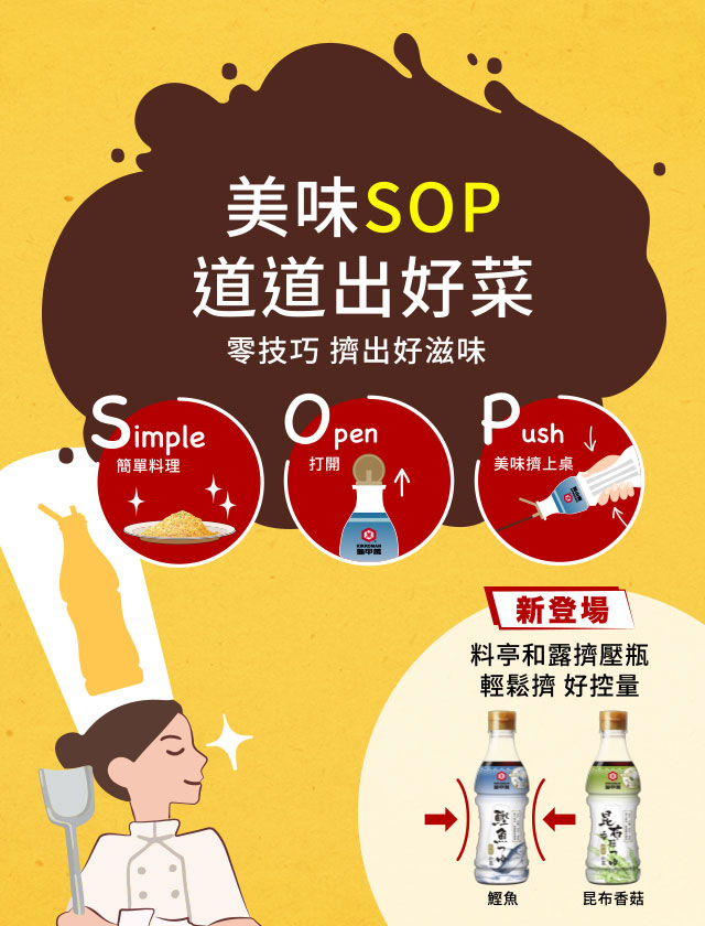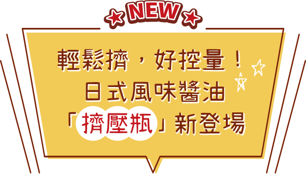 新包裝「擠壓瓶」只要輕輕一擠,醬油便能適量加入菜餚,讓你更好控制與拿捏份量,不怕調味一失手,使料理無法回天,煮菜心情超輕鬆~料亭和露新擠壓瓶,讓美味料理輕鬆「擠」上桌!